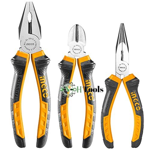 The Ingco 3 Pcs Pliers Set is a toolset designed for general-purpose use, suitable for both professional tradespeople and DIY enthusiasts. This set typically includes three types of pliers that are essential for various tasks such as gripping, cutting, bending, and manipulating materials. Below is a detailed breakdown of the features, specifications, and uses of this product:
